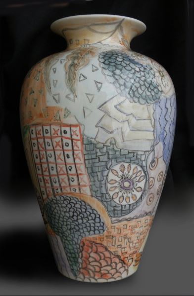 Ecco le anfore a lungo collo non ansate, a corpo cilindrico liscio o graffito in minuscole incisioni rieditanti i graffiti rupestri o le voci testimoniali di Pitthecousa (VII sec.a.C.) - quel “Mare nostrum", omaggio alla storia delle genti mediterranee, vede più passaggi tamponati di colore: ventaglio cangiante sui toni indaco verde ed ottanio, come le onde del mare cipriota; così per il troneggiare del “Rosso”, reso fuoco ardente da mille piccole pennellate inneggianti a epiche contese omeriche. Con la tecnica raffinatissima dello sfumato, le atmosfere estive mattutine del setoso blu regalano alle Ollae rotonde di "Cielo” un dispiegarsi azzurro di foglie volteggianti; al globo meridiano “Rouge et Noir”, l’incandescenza del rosso solare, con la nera semantica apotropaica di atomi stilizzati; infine, alla curva ovaliforme del “Tramonto”, la nota soffusa dell’onirico viola. Nell’ampio spazio della cantina, su piedistallo, vasi sempre a varia tematica, in una profusione di colori e forme stilizzate: “Irlanda”, a fittissime strigilature nero-verde, ricorda brumosi concerti di marine e vallate solitarie; il liberty "Garden", apre il ricordo alla produzione di Gallé, per quello sfumato a campo verde con sottilissime incisioni e foglie;. "Fantasia 1" e “Fantasia 2”: due diversi formati, dove la delicatissima resa policroma inneggia nel comporre inusitati accordi rosati e glicine verde salvia e azzurro, fino ad osare il terra di Siena e il porpora...Campi d’indagine visiva in sé conclusi nei lobati motivi di innesto a corolla in alternarsi ad accenni di simbologia minimalista.