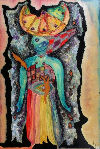 Quindi, sia il nomen omen: poiché piace pensare ad Erre, valicando la nota fleurie di Rossella, quale fonèma della riposta identità, per la voce di una sacerdotessa - esce dalla Storia, effigie iconica, ed alla Storia si riallaccia per l'anemos, l' ispirazione - dedita a culti millenari. Accostando il sensus animi di quella metempsicosi, viaggio di un'anima approdata da universi reali od immaginifici che la mente non teme d' indagare, Erre sprigiona, semplicemente, l'aura, 'ieratica', secondo un élàn vital di rara positività che infonde a tutta la sua opera.