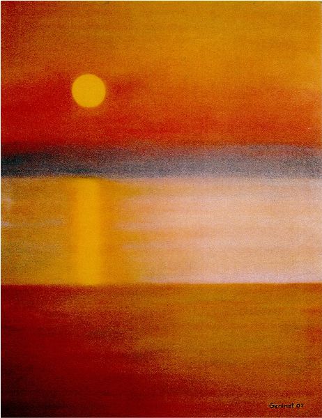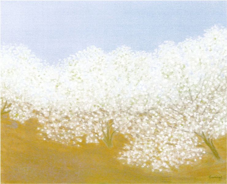 Il Paesaggio. Boschi e Radure. Nelle opere di Mirène dedicate al paesaggio francese a schema 'classico', baciata dalla luce è la delicata suggestione trompe-l'oeil della foresta. Cesellata miniatura in pieno rigoglio di svettanti guardiane a fluttuanti presenze – gli abitanti di un villaggio, oltre un campo di grano punteggiato di papaveri, immerso laggiù, nel pacato blue della sera – o di quei boschi, dove le chiome con la carezza di un rapido tratteggio suggeriscono il risorgere della primavera. L' anima verde - negli alberi sulle rive e l'aprirsi della radura in fiore specchiata nelll' infinito seducente riflesso del laghetto -...(Olii, Acrilici, Pastelli. Paysages Francais. Le Printemps. Paris, Galerie Christian Siret - Jardins du Palais Royal -, 2003 - 2004). 'Fotografa', Mirène, la sacralità dei quattro elementi – terra acqua aria fuoco - dell'avvicendarsi stagionale in impressioni ed emozioni di estrema raffinatezza compositiva: angolo visuale unico ma immediatamente condivisibile. Ci incamminiamo, al suo fianco, per un sentiero privilegiato, dove l'elegante cromatismo nella sfumata palette del grigio indica la gelida bruma invernale – rami spogli, ad inclinazione comunque non convulsa verso il pallido sole immerso in una lattea caligine -. Continuamo, oltrepassando quel sottilissimo e pressochè invisibile confine au lisière du bois, suggerito sotto voce dalla linfa vitale che continua ad pervadere, nell'incedere delle stagioni, 'quelle' foreste al risveglio primaverile. Quando un prato ancora arso dal gelo ha timore di accogliere germogli ma, sotto un cielo marzolino ancora pallido per l'ultima neve caduta, si copre di un nuovo respiro. Il bianco fiore degli alberi.