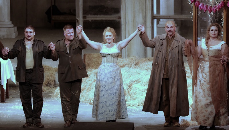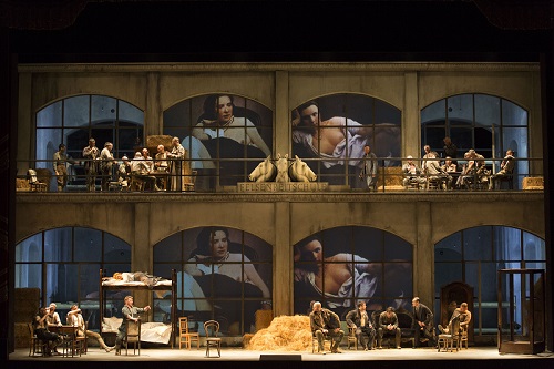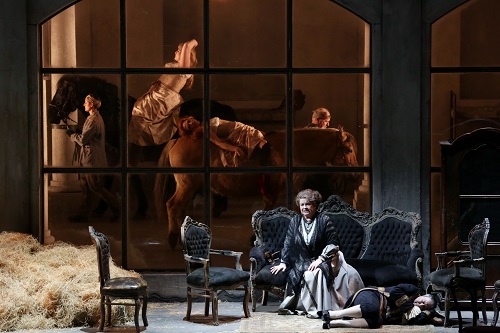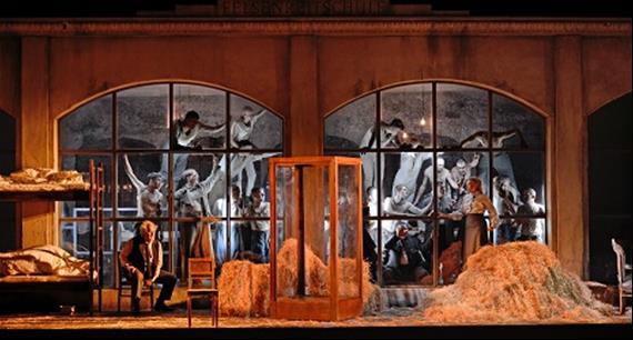 La Scala non è stata da meno, e ha costruito la scena, oltre le arcate a vetri, mostrando tre cavalli e tre amazzoni, sfondo silenzioso ma ugualmente allusivo. Un altro momento particolare dell’opera che si potrebbe definire ‘spettacolare’ e invece crea un turbinio dell’anima è il passaggio di una trapezista sospesa nel vuoto che attraversa su un praticabile tutto il palcoscenico, mentre sotto sul palco avviene una danza stilizzata su dei barili di fieno. Molte parti si focalizzano in una cabina di vetro collocata al centro del boccascena dove si consumano le effusioni o le violenze dei soldati e della protagonista. Non si cade mai nella volgarità e le modalità di spogliazione, senza alcuna nudità, accadono di pari passo con i vestiti, la mente, il gesto.